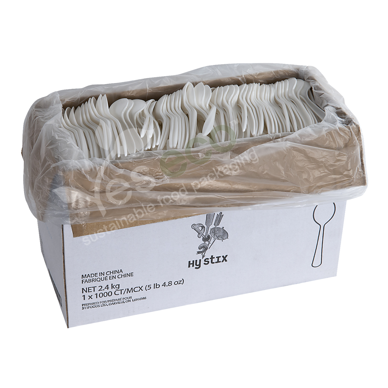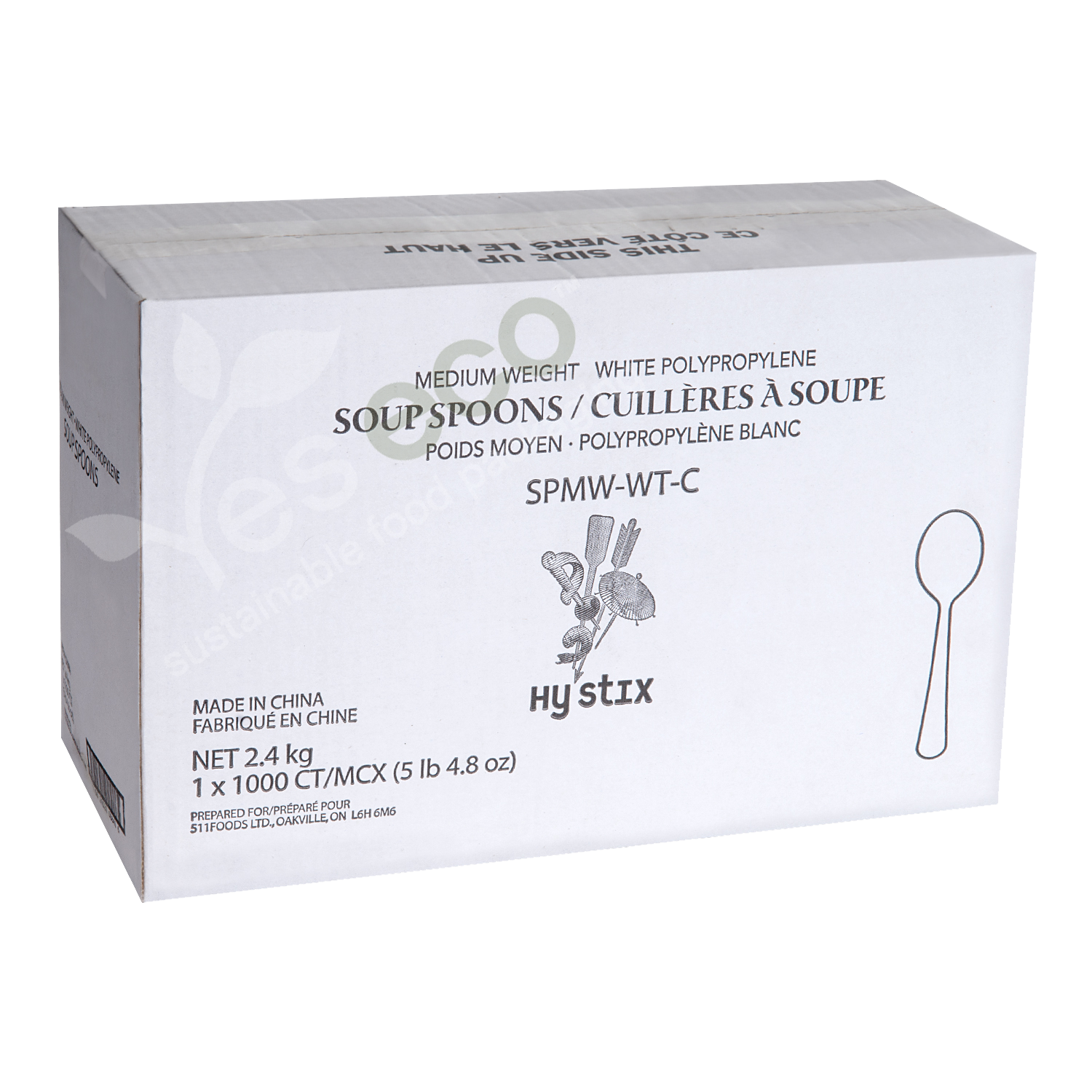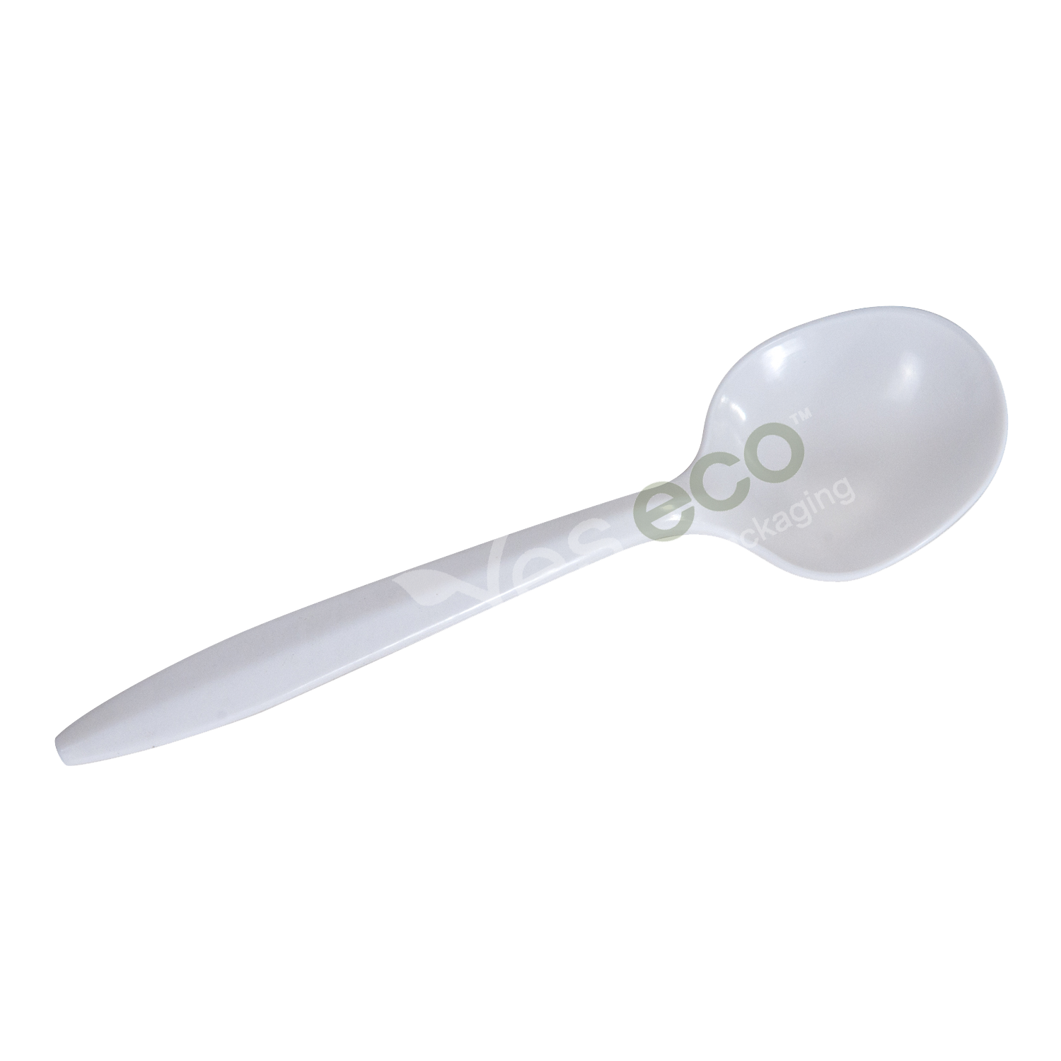 2.4g PP SOUP SPOON – white disposable plastic for use with soft foods and many firm foods such as potato salads, lasagna, sausages or hot dogs, and other dishes.